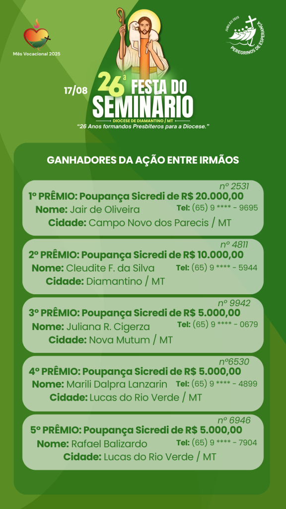 👉 É com alegria que apresentamos os ganhadores desta edição, que levam consigo não apenas os prêmios, mas também a lembrança de terem participado de um momento tão especial para toda a Diocese.